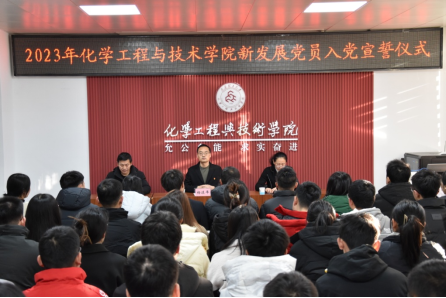 11月29日上午,学院党委在化工馆三层会议室举行2023年下半年新发展党员入党宣誓仪式。校党委组织部副部长杨滇平应邀出席会议,院党委书记张琤、全体学生党支部支部书记、55名新发展党员及积极分子代表参加会议。入党宣誓仪式由学院专职组织员孙海阳主持。